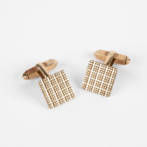 A pair of 9ct yellow gold cufflinks of textured square form, approximately 1.5cm wide, maker's mark 'KW', London 1966, total gross weight approximately 8.2g