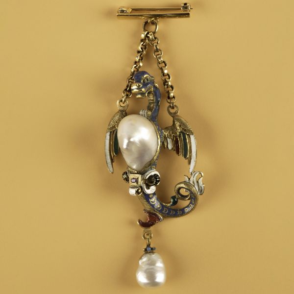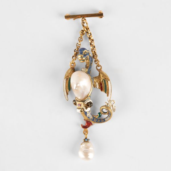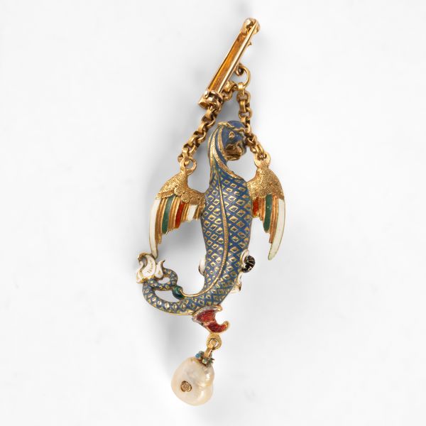 An Austro-Hungarian Renaissance Revival Sea Dragon pendant, set with a large baroque pearl to the abdomen, and suspending a further pearl drop, enamelled throughout, unmarked yellow metal, approximately 8cm long, on a later bar brooch, total gross weight approximately 24.8g