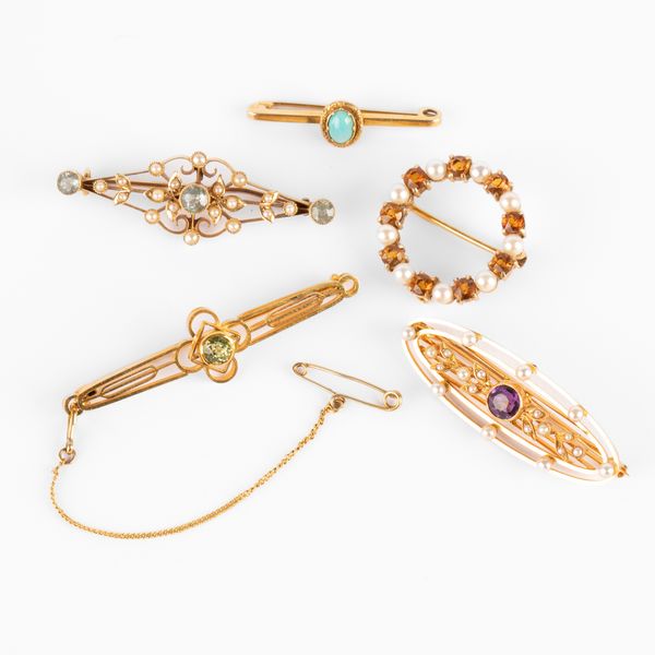 A collection of Victorian and later brooches, including an aquamarine and seed pearl bar brooch, stamped '15', approximately 4.5cm, total gross weight approximately 3.9g; an amethyst and seed pearl bar brooch, unmarked, approximately 4cm; a peridot bar brooch, stamped '9ct', approximately 5cm; a turquoise bar brooch, stamped '9ct', approximately 3.3cm; and a circular citrine and pearl wreath brooch, stamped '9', approximately 2.5cm, total combined gross weight of 9ct approximately 14.7g, three with fitted cases (5)