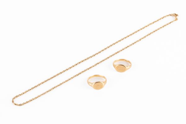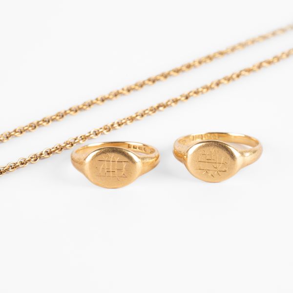 Two 18ct yellow gold signet rings, including a Victorian example, ring size L1/2; and an Edwardian, size N; together with a yellow metal chain, stamped '750', total combined gross weight approximately 15.1g
