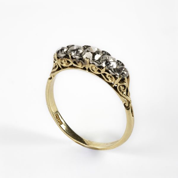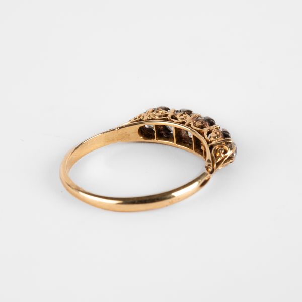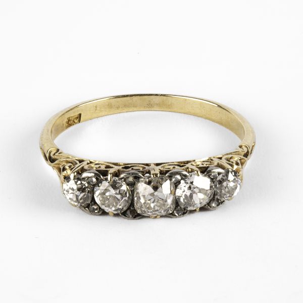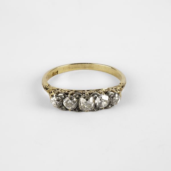 A Victorian yellow metal and diamond five stone ring, set with graduated old cut diamonds, the principal stone approximately 3.6mm x 3.9mm x 3.1mm, ring size N, stamped '18c', total gross weight approximately 2.6g