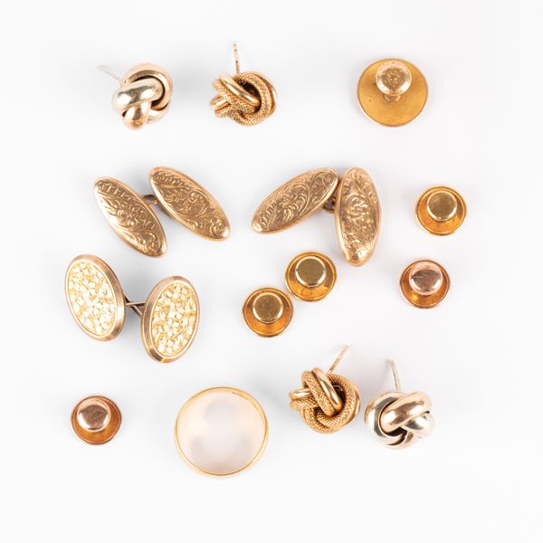 A collection of gold jewellery, including a Victorian 22ct yellow gold band, ring size K1/2, gross weight approximately 3.6g; a 15ct yellow gold stud, gross weight approximately 1.7g; and a collection of 9ct yellow gold studs, cufflinks and earrings, total combined gross weight approximately 13.8g