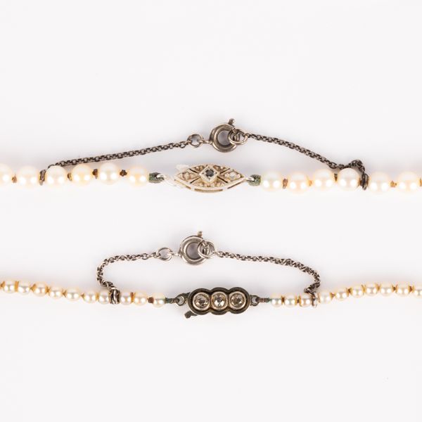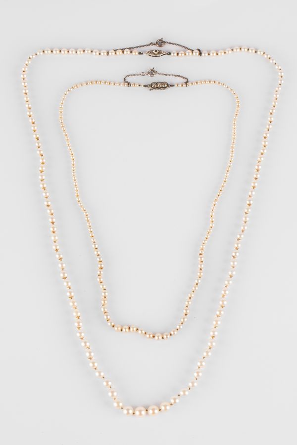 Two graduated pearl necklaces, to include a 67cm long graduated cultured pearl single strand necklace, smallest approximately 4mm - 6.5mm, on a 9ct white gold clasp; and a smaller single strand of untested pearls, approximately 47cm long, smallest 2.7mm - 4.9mm, unmarked white metal clasp set with three old cut diamonds