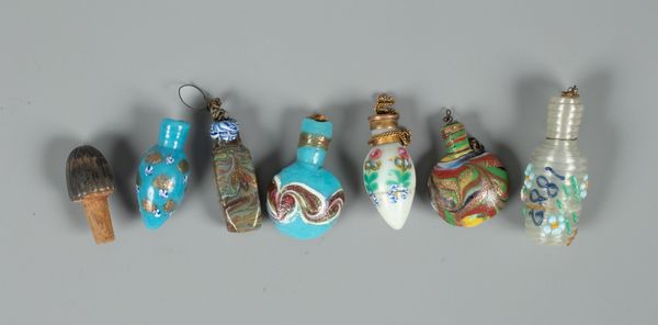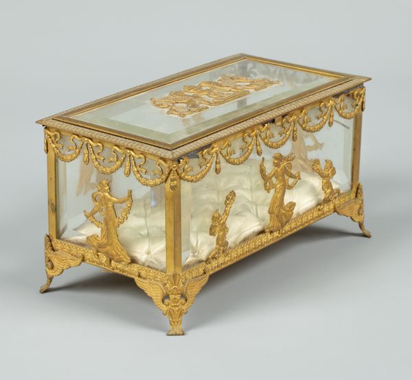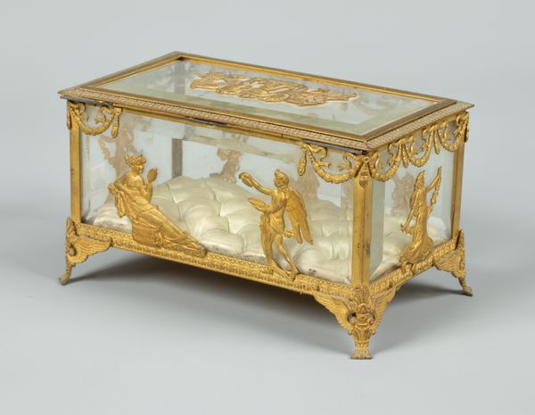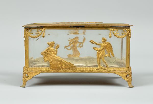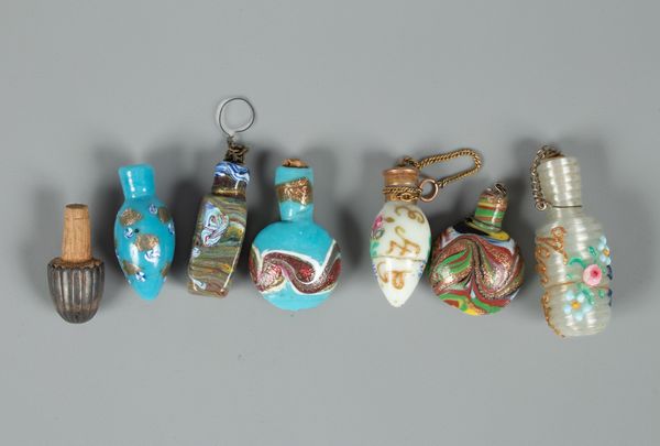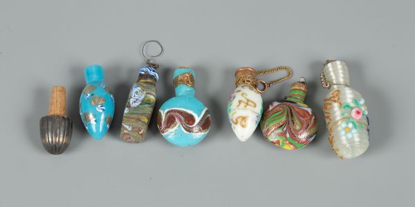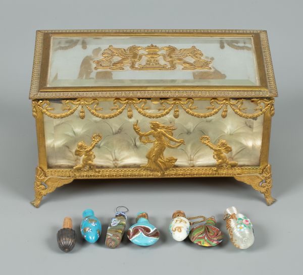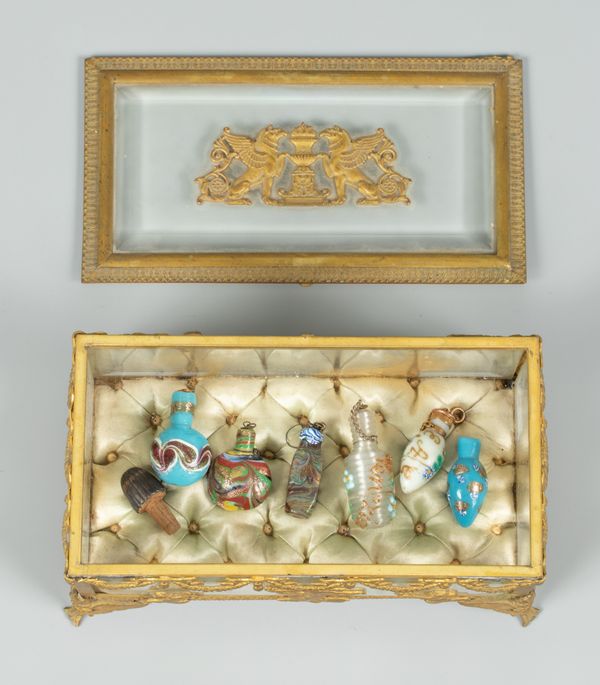 A gilt-metal mounted glass casket, containing a number of miniature scent bottles including three Venetian miniature bottles with aventurine, the largest scent bottle 4.5cm, the casket 18cm wide