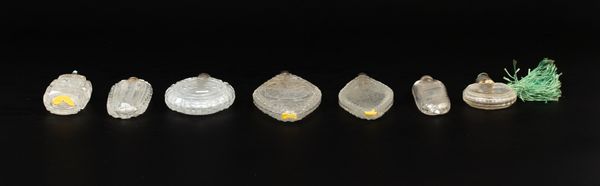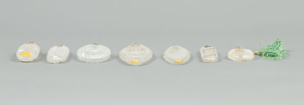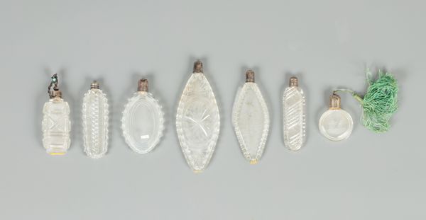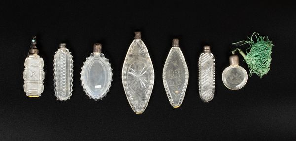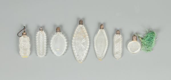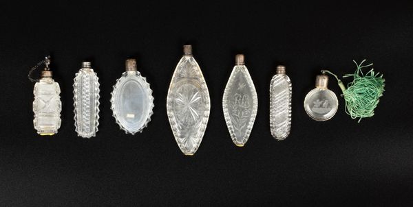 Seven Georgian clear glass flattened perfume bottles, late 18th/early 19th Century, three with notch cutting to sides, one engraved with two small birds, the largest 13.5cm long