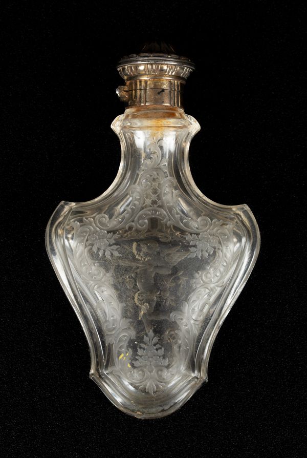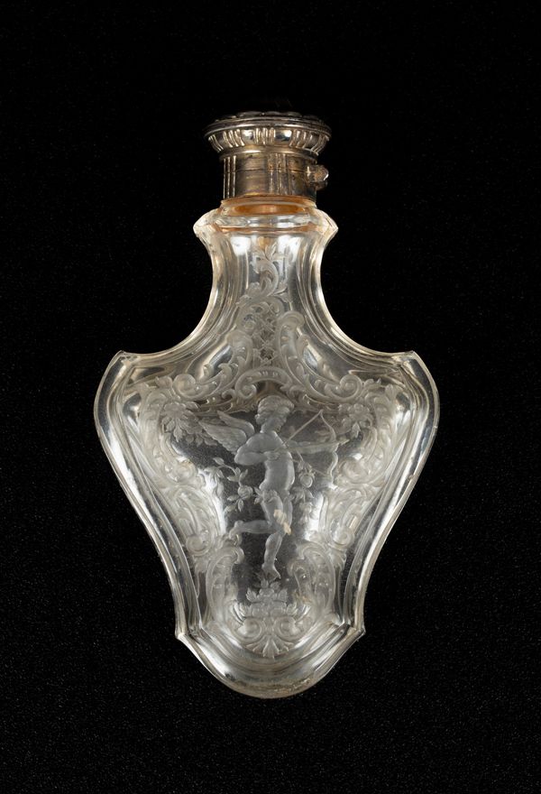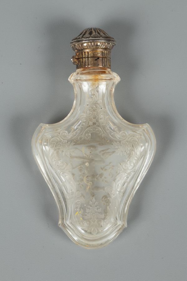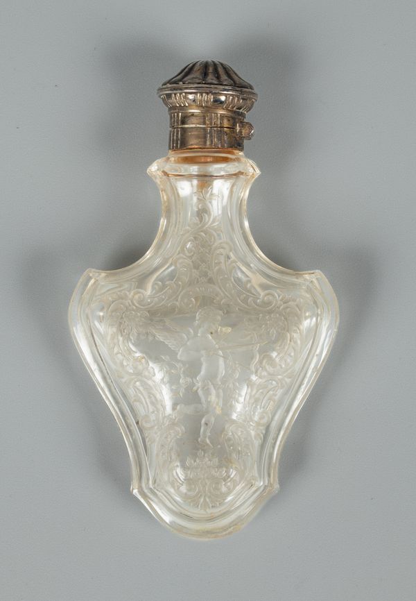 A Continental clear glass shield-shaped flattened scent bottle, perhaps Silesian, engraved with a floral wreath border, one side centred with Cupid, with a silver-gilt hinged cover, 9cm long