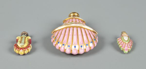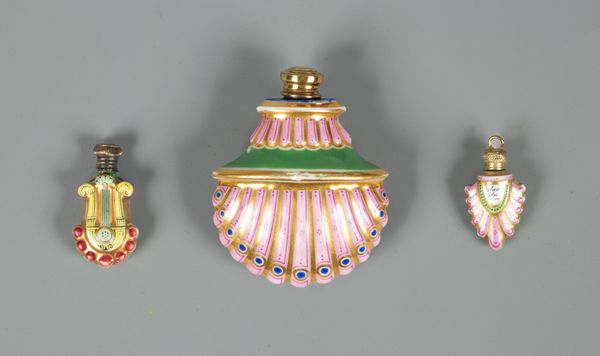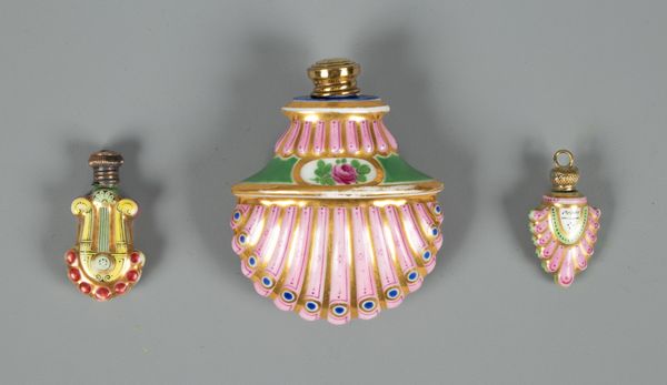 Three Paris porcelain scent bottles, mid 19th Century, comprising a miniature bottle in the form of a lyre, another miniature in the form of an acanthus inscribed ‘couer don du’, and a larger bottle in the form of a shell, 6cm high