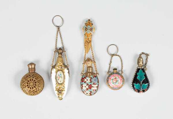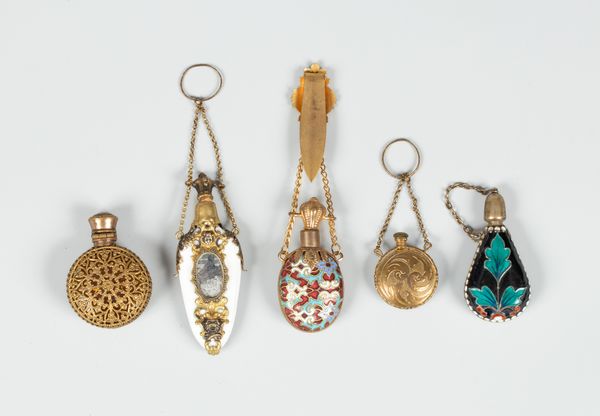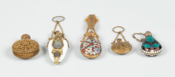 A white glass tapering scent bottle with baroque gilt metal mounts, set flower panel and opposing mirror, 7.5cm long, two cloisonne enamel scent bottles, the drop-shaped example late 19th Century, Russian, and two gilt-metal circular bottles
