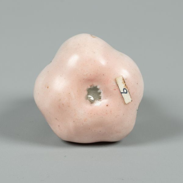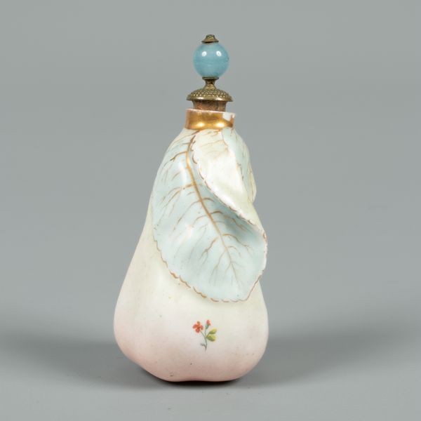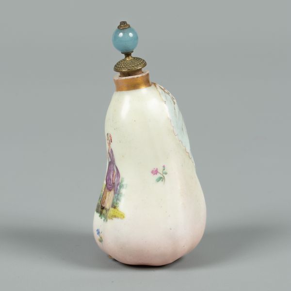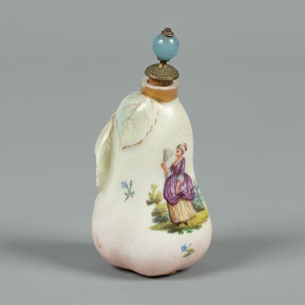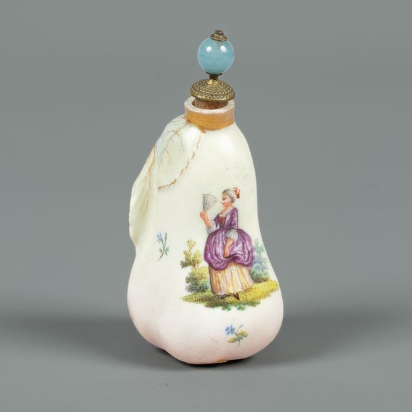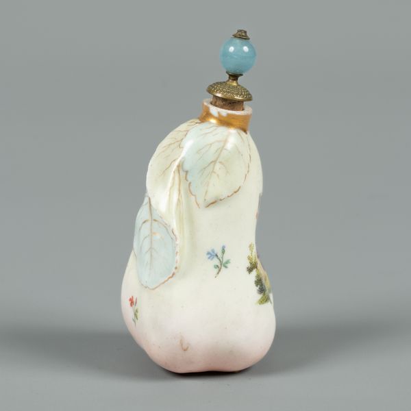 A German porcelain scent bottle in the form of a pear, 19th Century, shaded ground cream to pink, the leaves picked out in blue, painted a figure of a girl, 6cm high