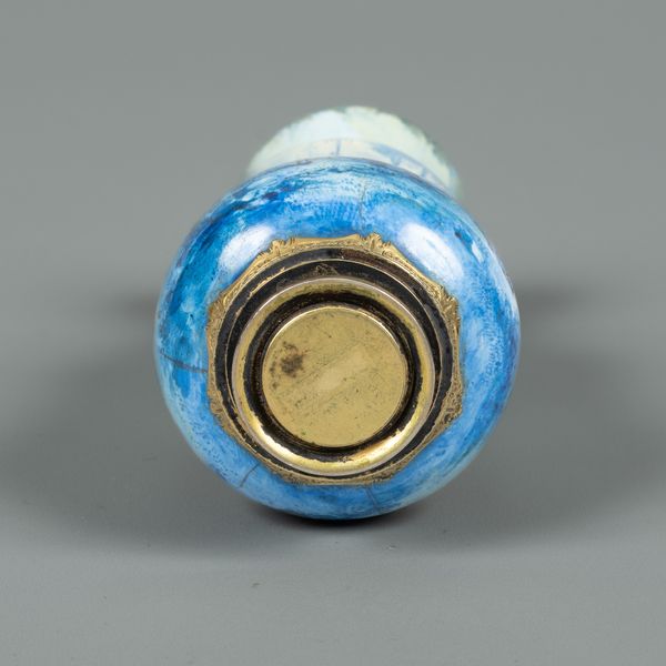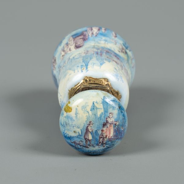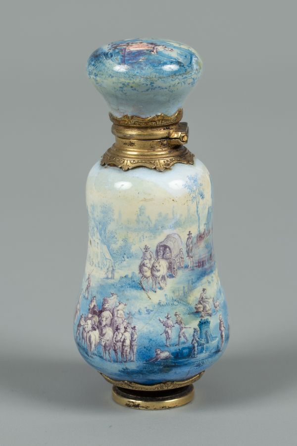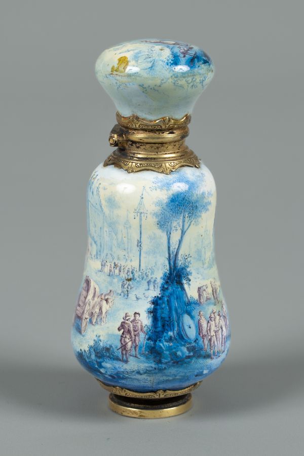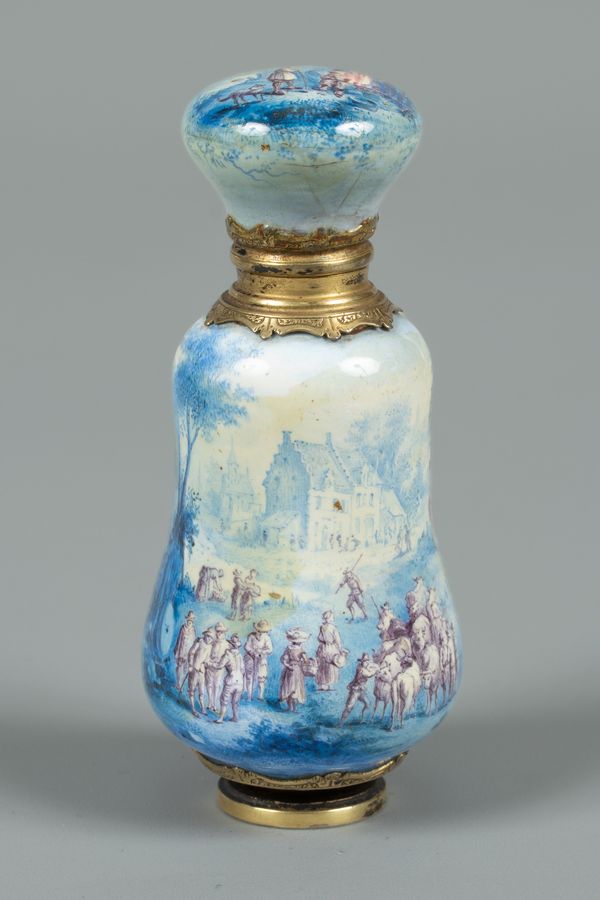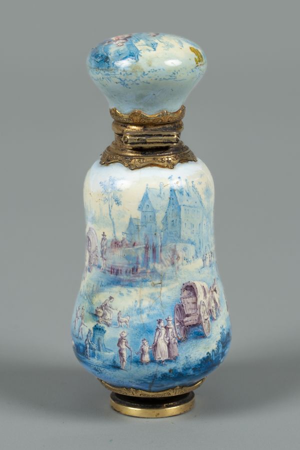 A French enamel scent bottle, 19th Century, decorated a continuous scene in shades of blue and manganese figures, waisted form, 8cm high