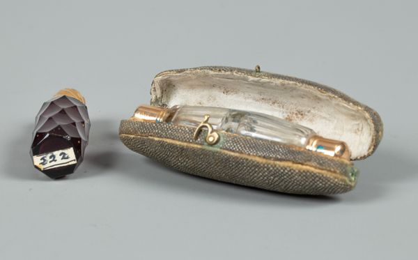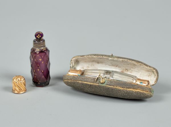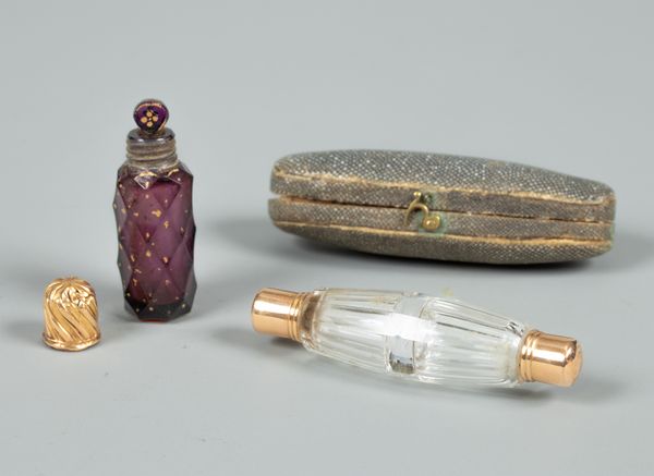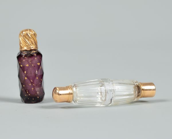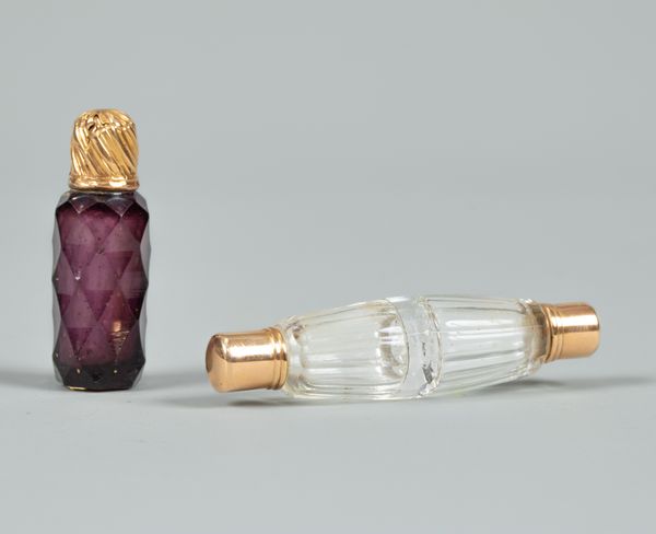 Two Georgian gold-mounted scent bottles, one clear glass double-ended, 6cm long, the other faceted amethyst glass gilt with stars