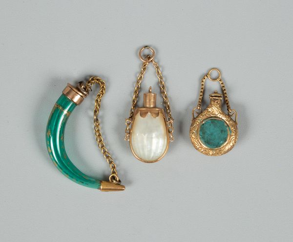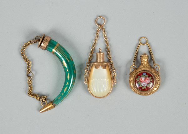 A small Georgian green glass horn-shaped scent bottle, a carved mother-of-pearl engraved gadrooning and a flattened circular example enamelled to the front, gold mounts, 4cm long