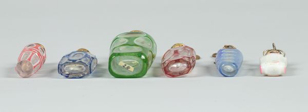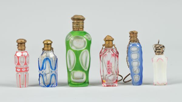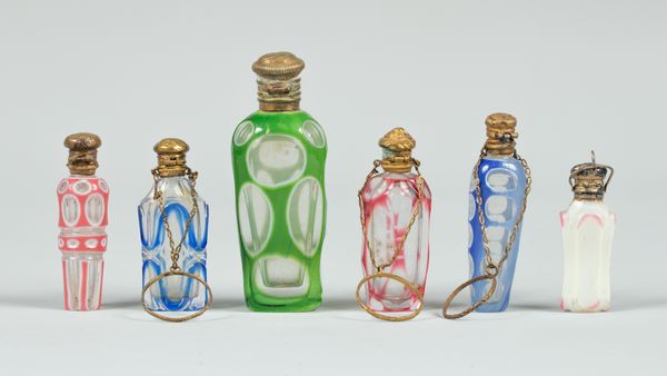 Six Victorian clear and white flash overlay scent bottles, various colours, gilt-metal mounts, the largest 8cm long