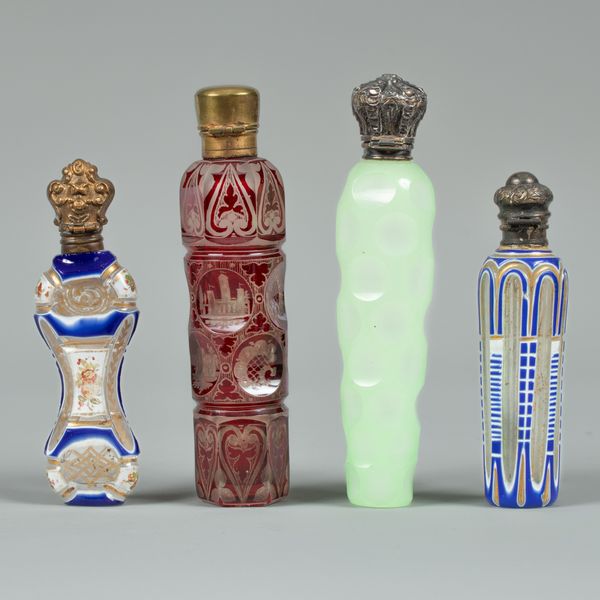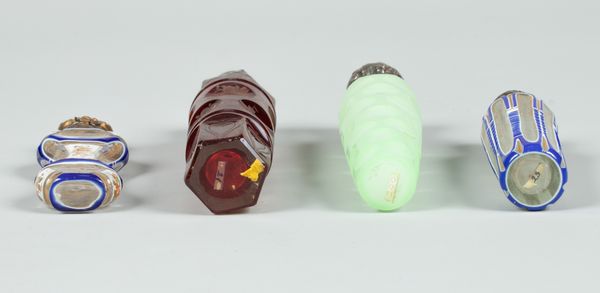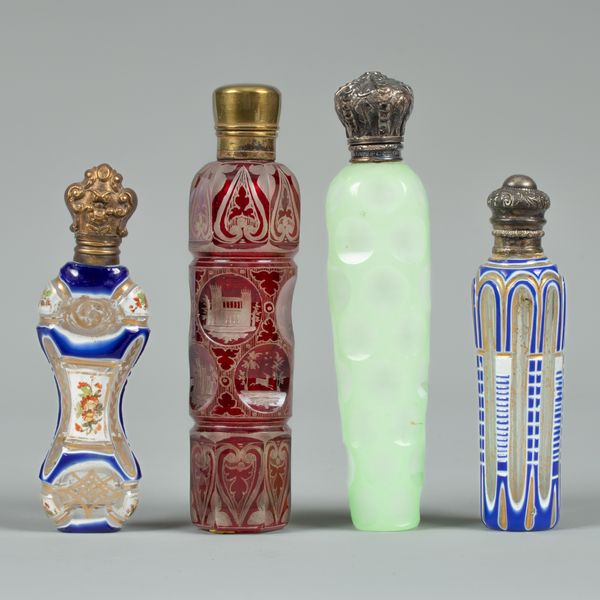 Four cut and overlaid/stained scent bottles, late 19th Century, one Bohemian ruby-stained and engraved with castles and stags, two with blue and white overlay and heightened in gilt, the fourth with a pale green overlay cut with circles, the largest 13cm long