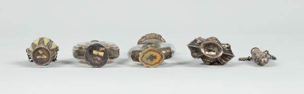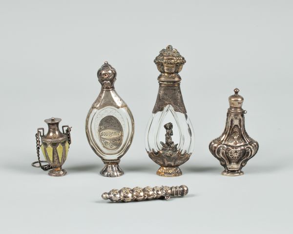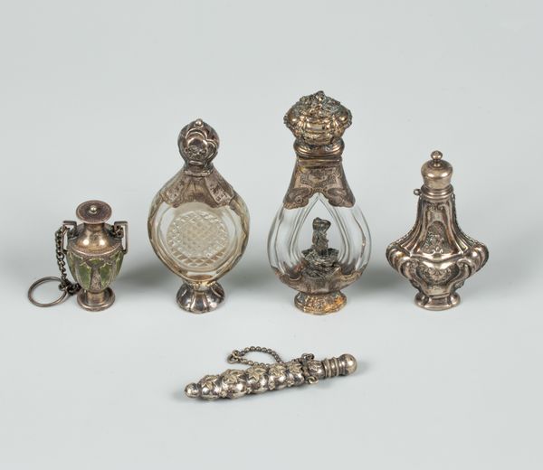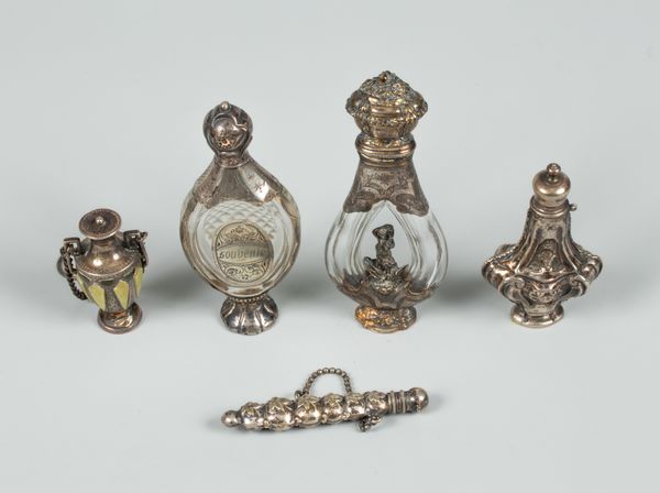 A Victorian hardstone mounted silver scent bottle, Birmmingham 1891, of amphora form, bottle 5cm high, an unusual Continental silver-mounted glass double scent bottle, 19th Century, 12cm high, a white metal mounted cut glass scent bottle marked 'Souvenir', 10cm high, another white metal example and a silver plated scent bottle or needle case (5)