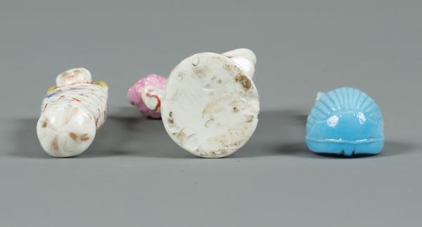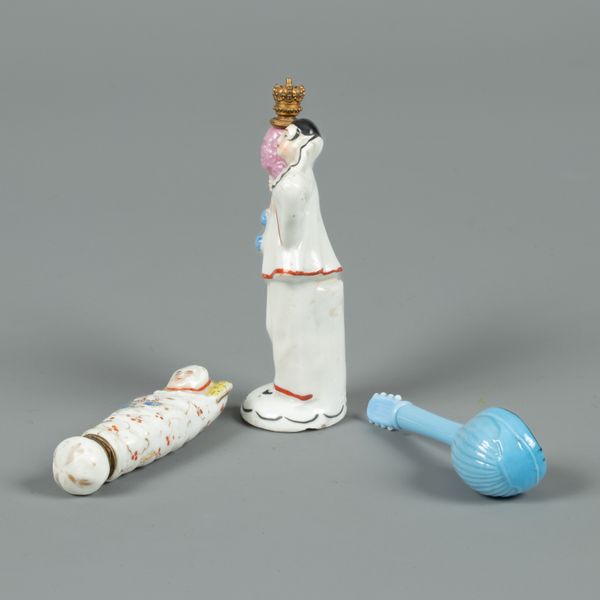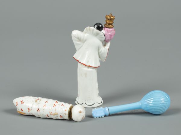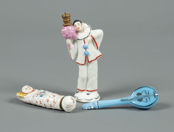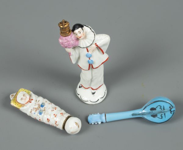 A German porcelain figural scent bottle of a standing clown holding a bunch of flowers, 9.5cm high, together with a bottle in the form of a lyre, and one of a ‘wickelkind’