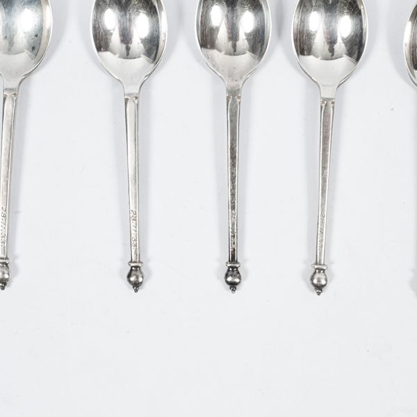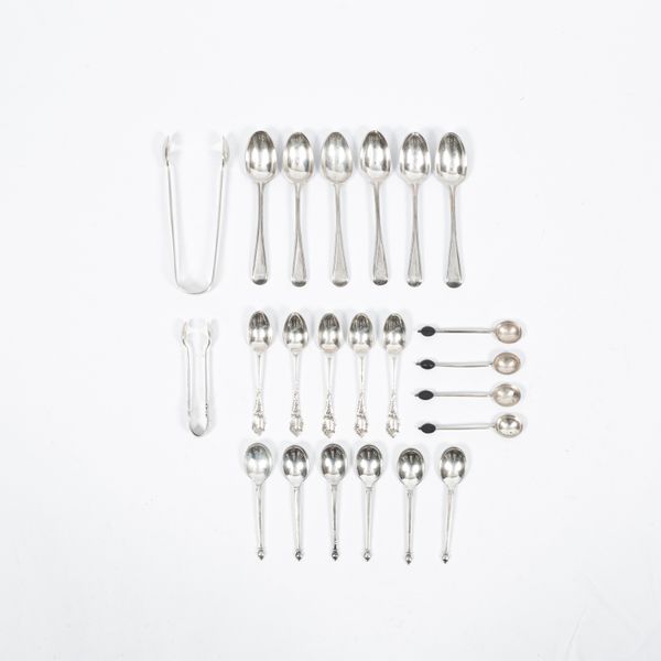 A set of six Victorian silver bead edge teaspoons and the matching tongs, GA, London 1870/1871, monogrammed, a set of six coffee spoons, DF, London 1932, dated to stems, 28.11.33, a part set of five teaspoons, dated to bowls etc., approximately 383g