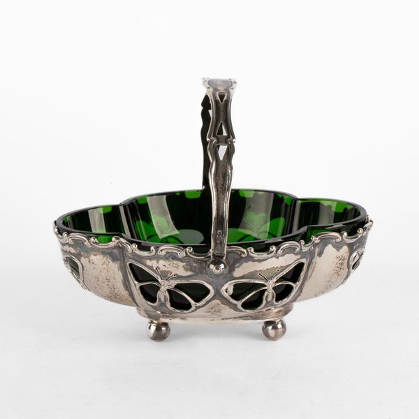 An Edwardian silver swing-handled basket, William Henry Sparrow, Birmingham 1905, of shaped oval form, pierced with butterfly motifs, with green glass liner, on four ball feet, 13.5cm long, approximately 86g