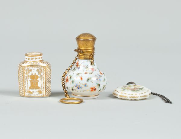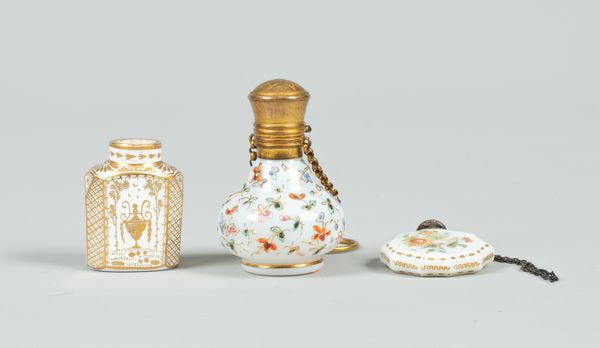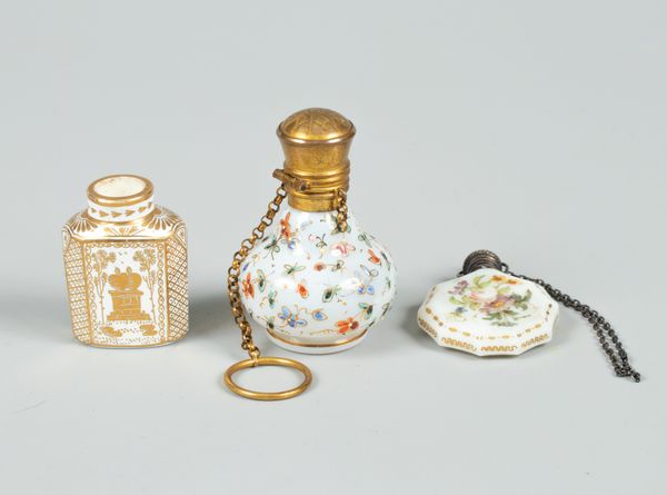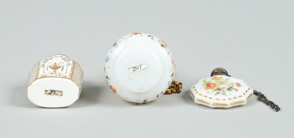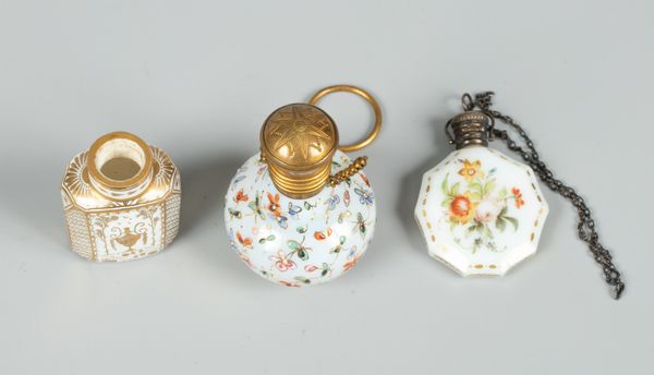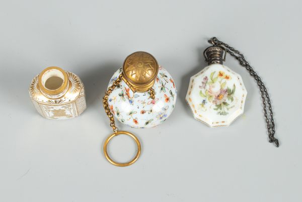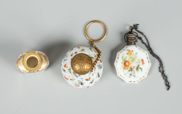 An opaline glass baluster-shaped scent bottle enamelled with flowers, a flattened white glass decagonal scent bottle painted with flowers, and a porcelain bottle of faceted rectangular form, decorated all over in gilding with lattice, urns and hearts, 5.5cm high