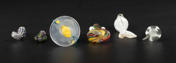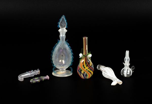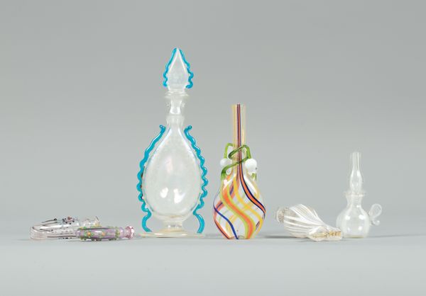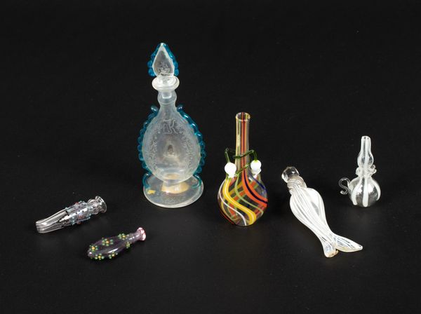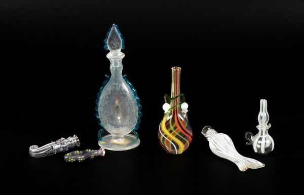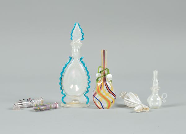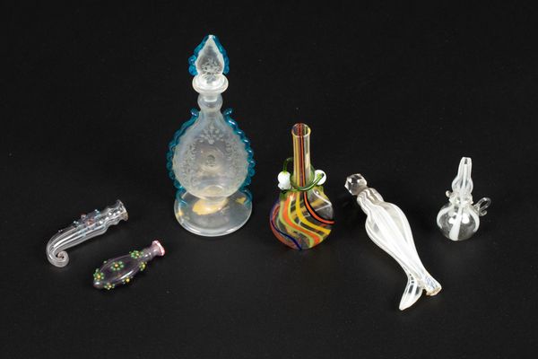 Two small Continental glass scent bottles with beaded flower decoration, a Nailsea style boot-shaped bottle, a small bottle similar, a bottle with stripes and a Venetian style flattened pear-shaped bottle, the edges trailed in turquoise, 12cm high (6)