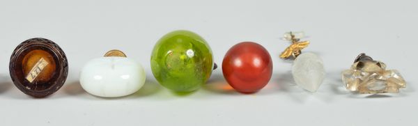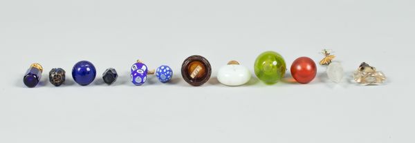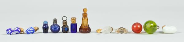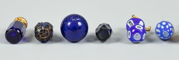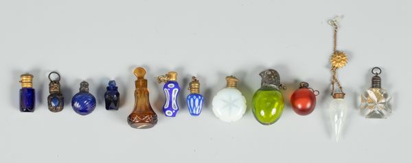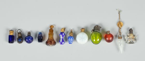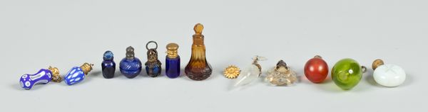 A group of twelve Victorian glass scent bottles, including one green glass with bird head finial, one Maltese cross, and six miniature blue glass examples etc., the largest 4cm high