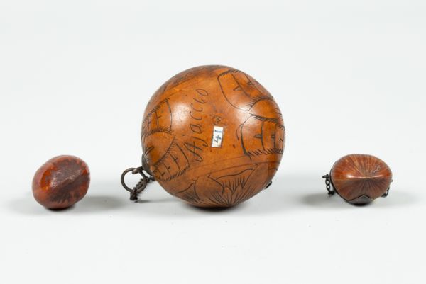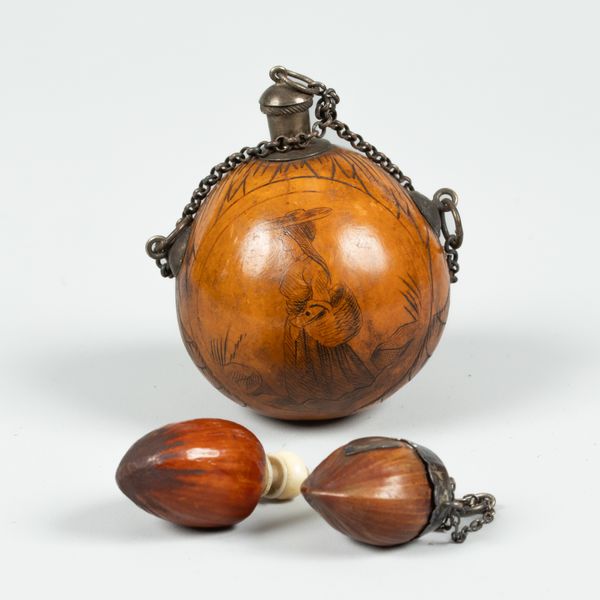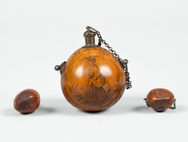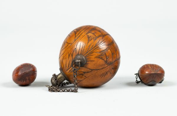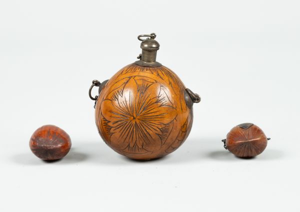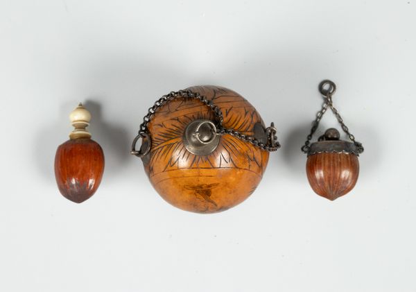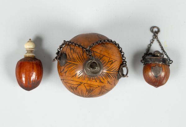 Two scent bottles formed from hazelnuts, two with white metal mounts, and a globular nut/seed bottle engraved with a figure and flowers and the word ‘Ajaccio’, 5cm high