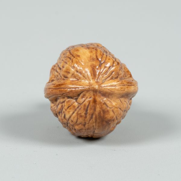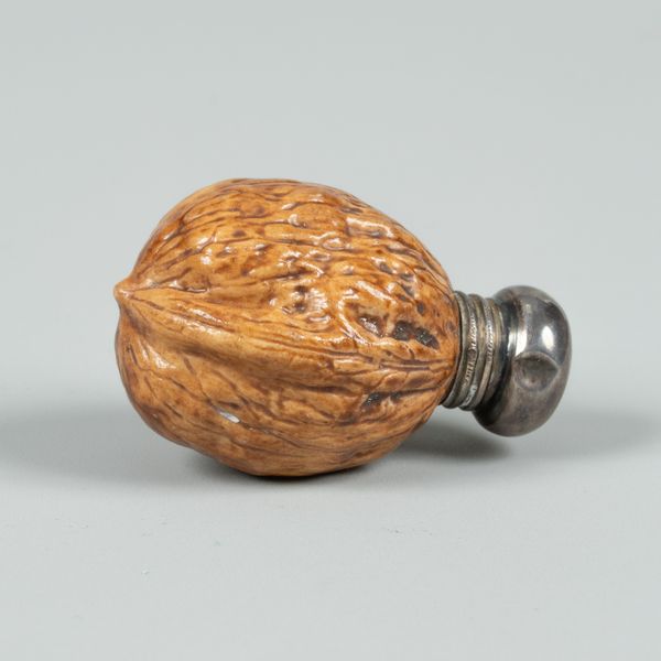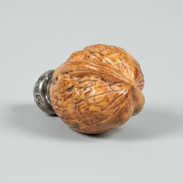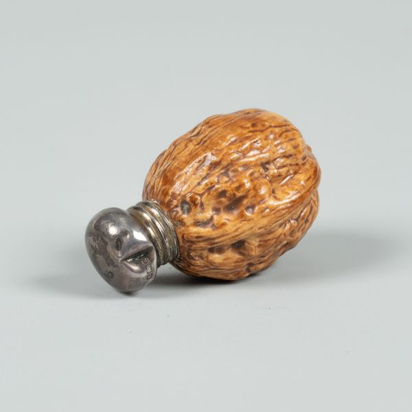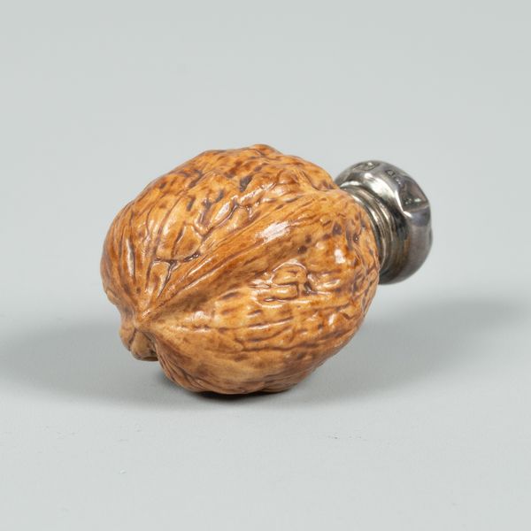An English porcelain novelty scent bottle in the form of a walnut shell, silver mounts, 5cm long