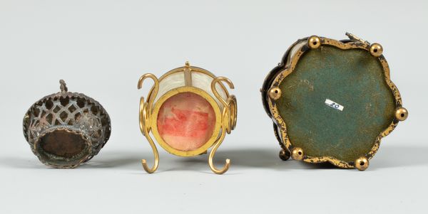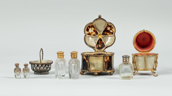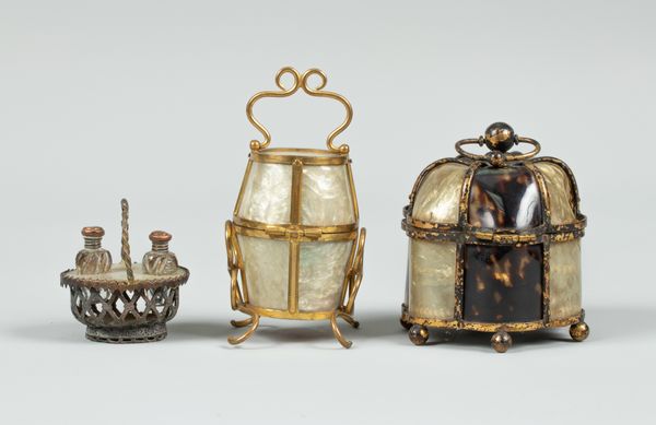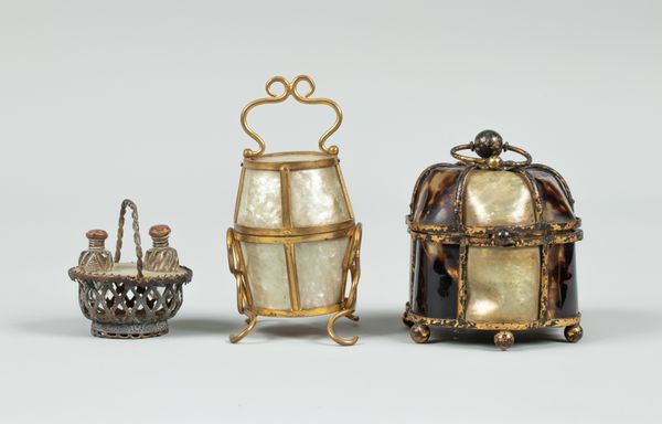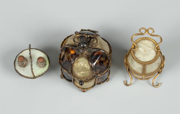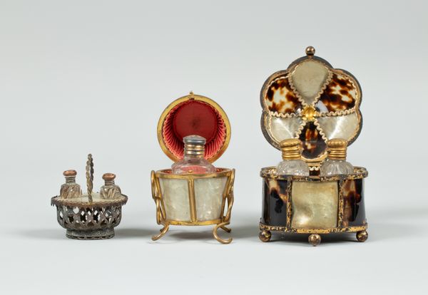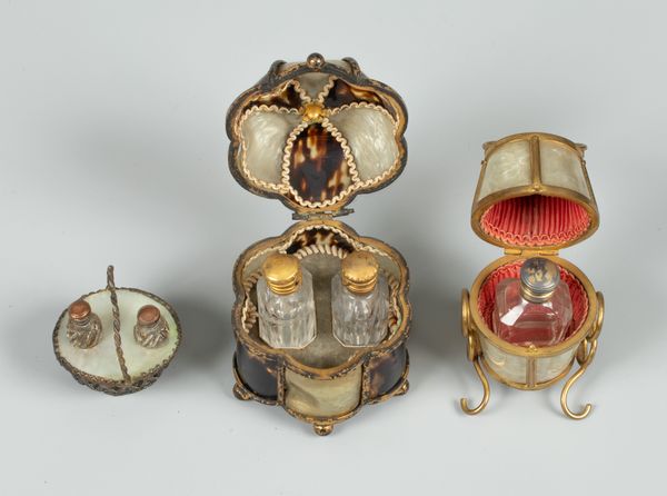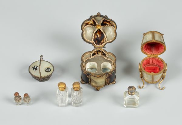 A novelty scent bottle holder modelled as a basket with two small glass scent bottles set in the mother-of-pearl top, 5cm high, another modelled as a lobed casket in alternating panels of faux tortoiseshell and faux mother-of-pearl containing two scent bottles and another containing a single scent bottle (3)