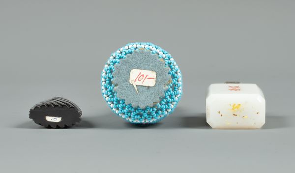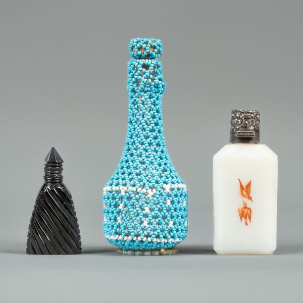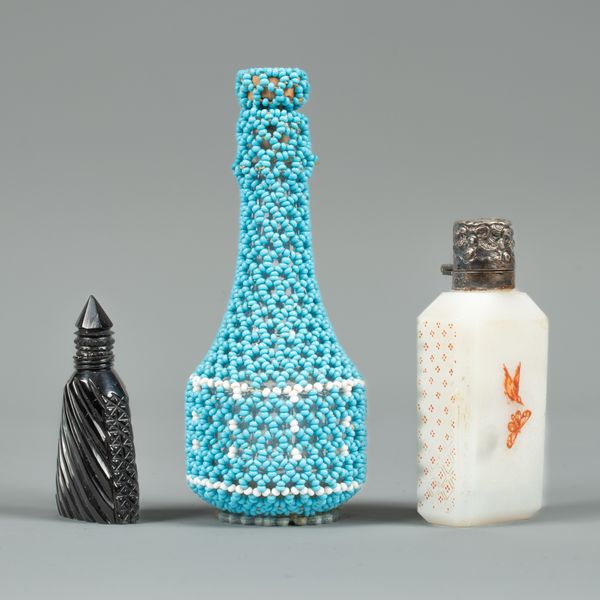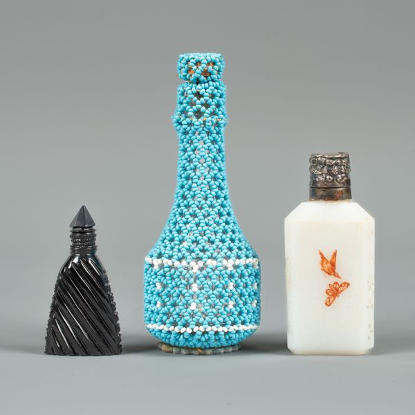 A Victorian white agate scent bottle, enamelled in red with butterfiles, the silver mounts Birmingham 1893, a carved jet bottle and a beadwork covered scent bottle, 12.5cm high (3)