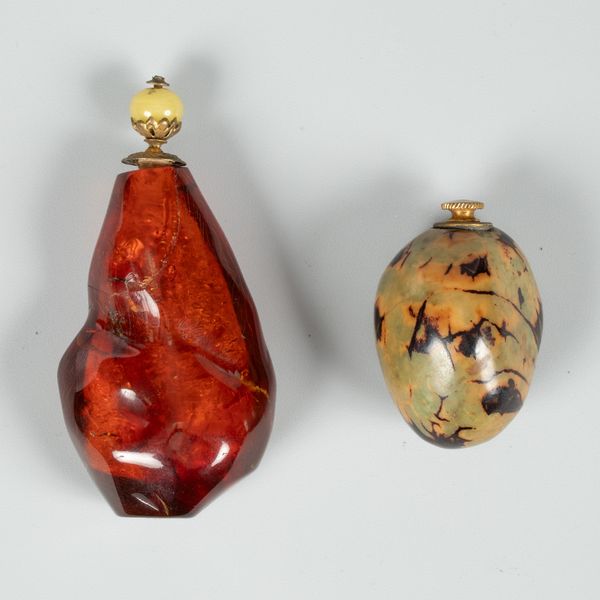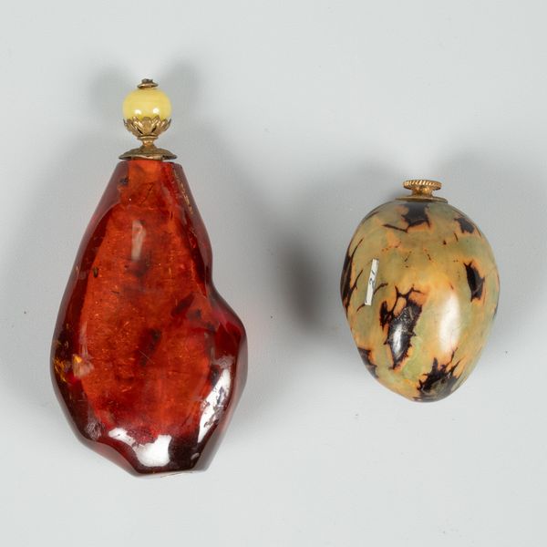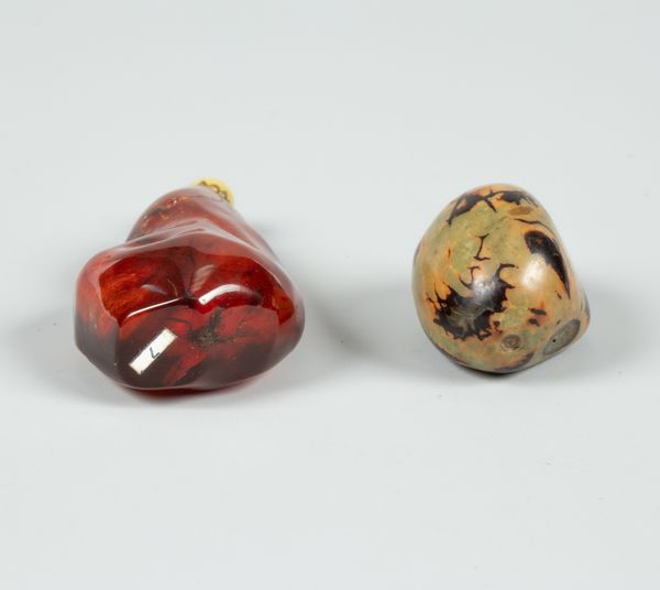 A natural amber scent bottle of irregular shape with glass bead stopper, 8cm high and another of polished pebble form with gilt stopper, 4.5cm long