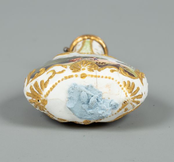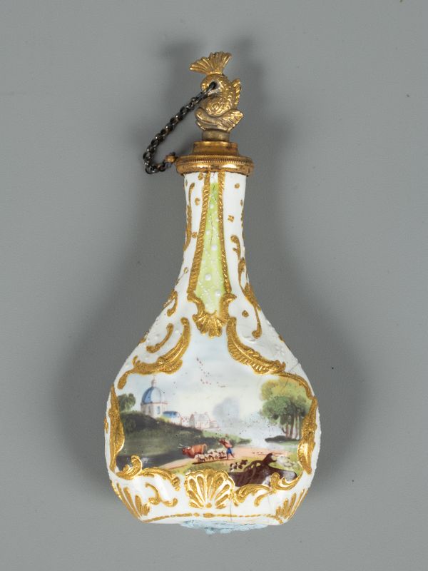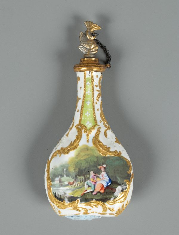 A South Staffordshire enamel scent bottle, late 18th Century, of low bellied form, painted to one side with lovers resting in a waterside landscape, the other side with a farmer, herd and buildings, within gilt scroll cartouches against a white ground, dolphin stopper, 10cm high