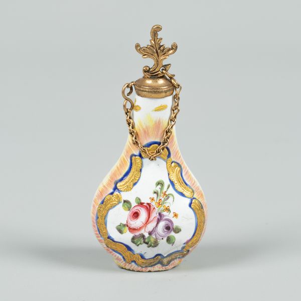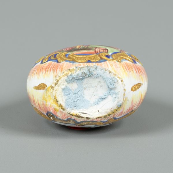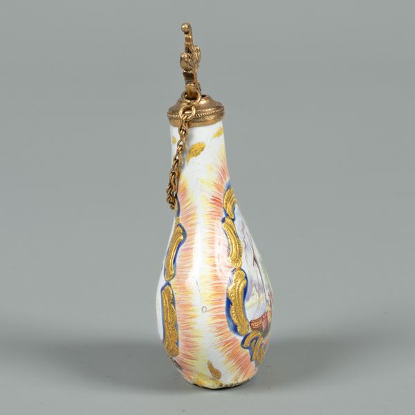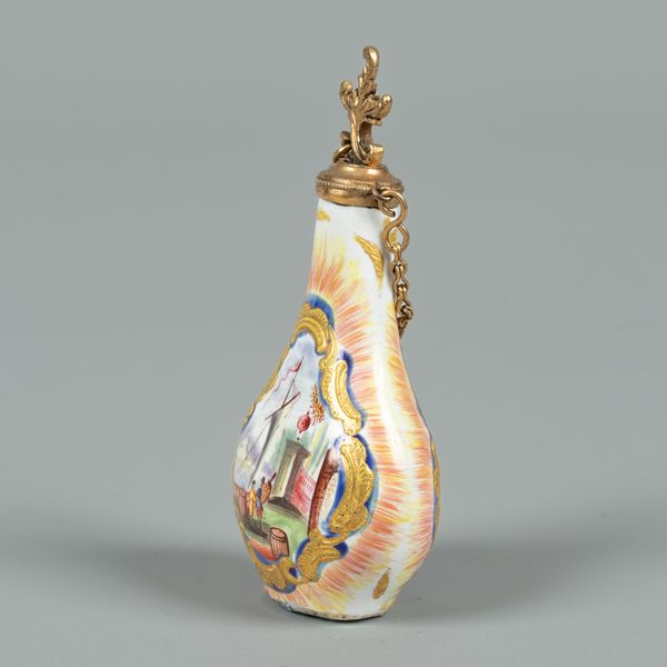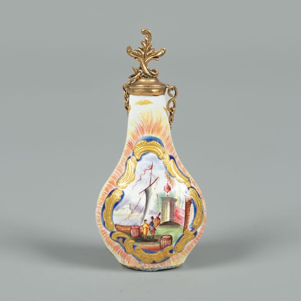 A Bilston enamel scent bottle, late 18th Century, of low bellied form, painted to one side with figures and a boat in landscape, the other side with flowers, within gilt scroll cartouches, red and yellow starburst emanating around on a white ground, leaf stopper, 7.5cm high