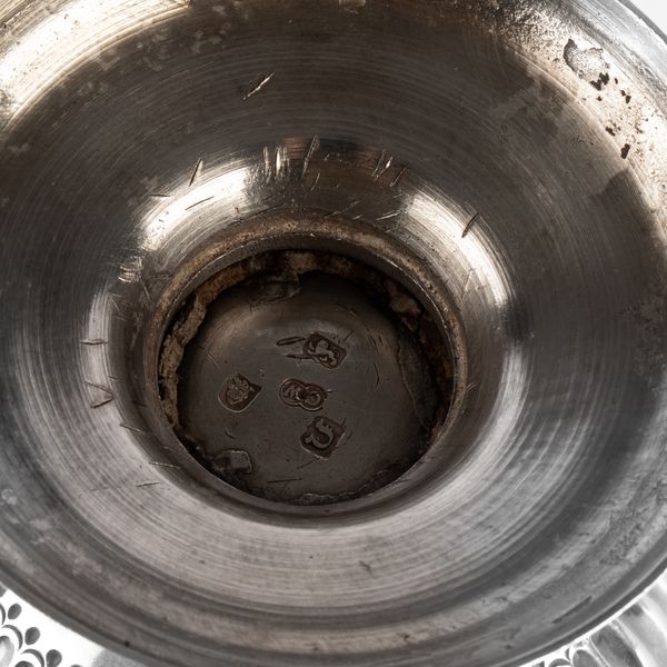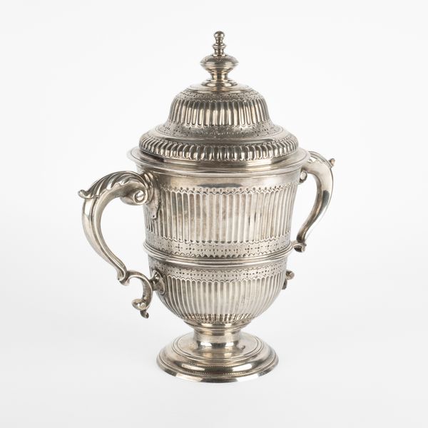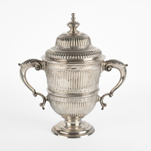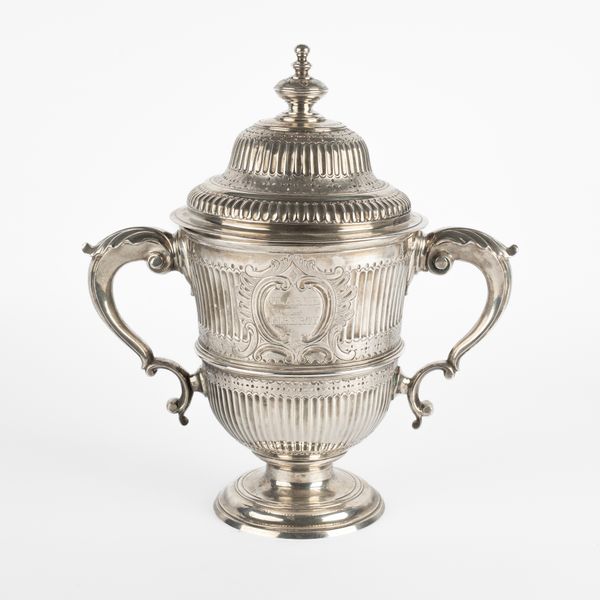 A George III silver two-handled cup and cover, Charles Wright, London 1768, the domed cover with vase finial, fluted decoration throughout and inscribed 'CLARKE and LIBERTY' within a cartouche, 30.5cm high, approximately 1767g