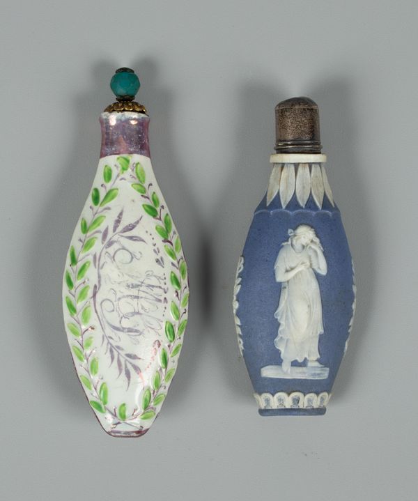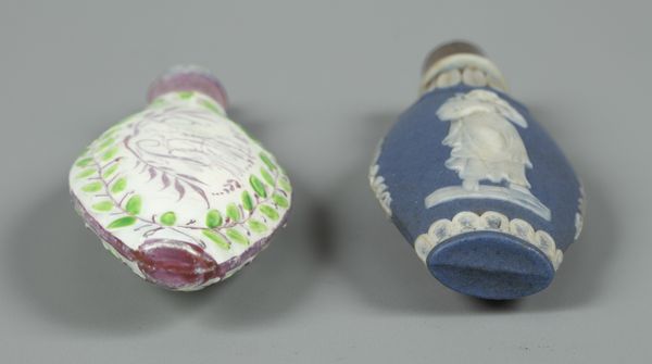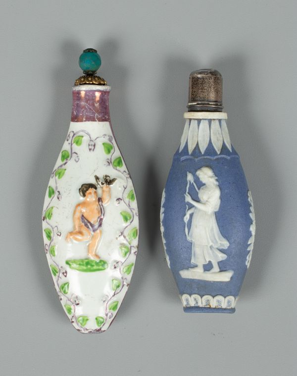 A Staffordshire pottery scent bottle, flattened oval moulded with a putto and bird within ivy leaf border, picked out in colours and with pink lustre collar and initials to reverse, 9.6cm long, together with a blue jasperware scent bottle decorated Classical figures, circa 1800, 8cm long