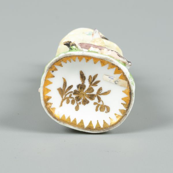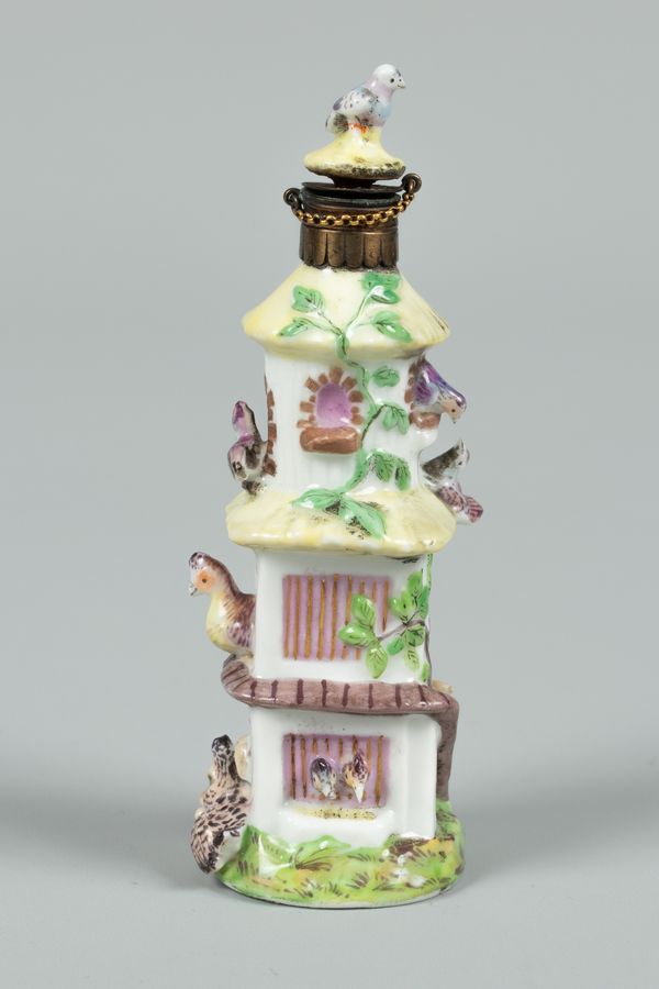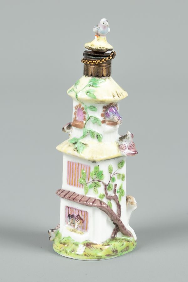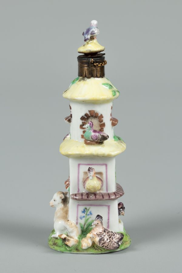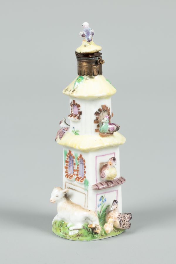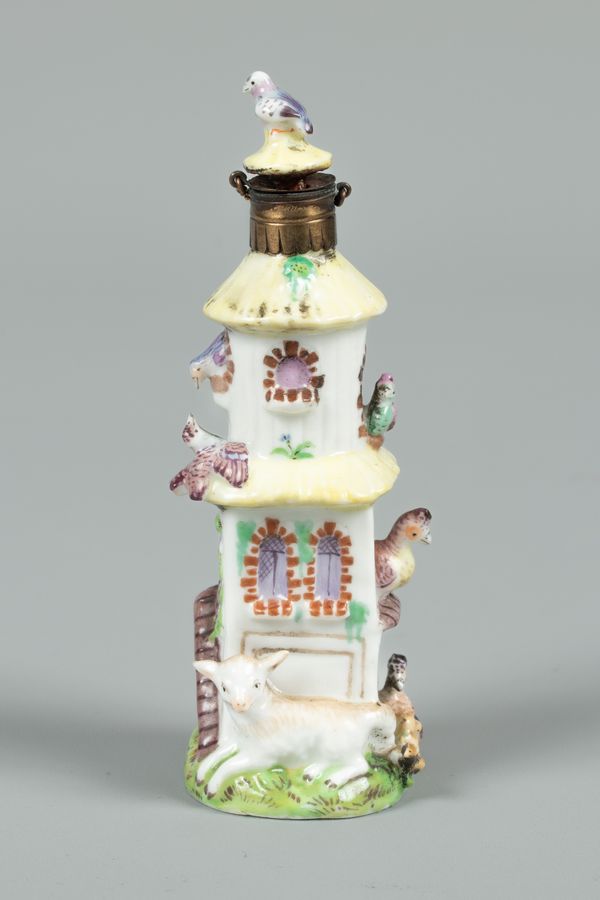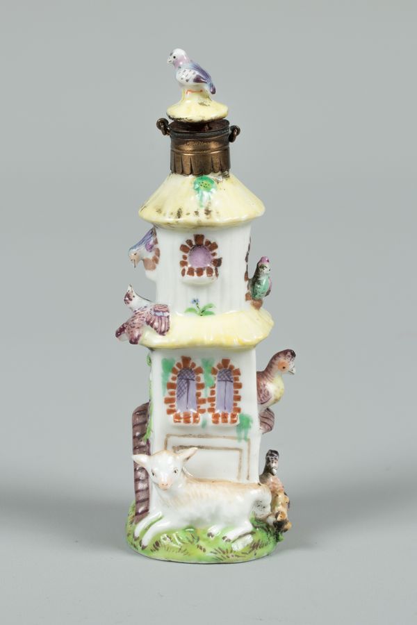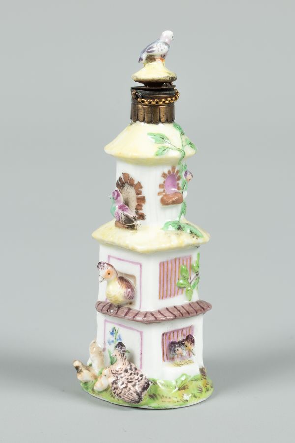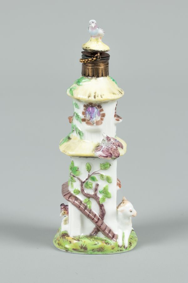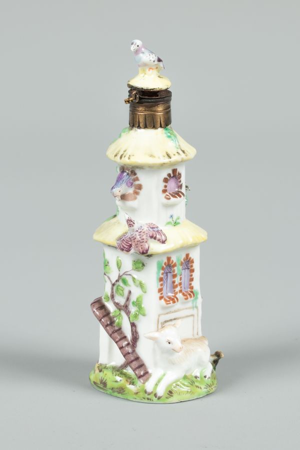 A Chelsea porcelain scent bottle, circa 1760, in the form of a three-story dovecot, applied birds and a lamb to base, naturally coloured, with bird stopper, gilt flower detail to underside of base, 9.5cm high