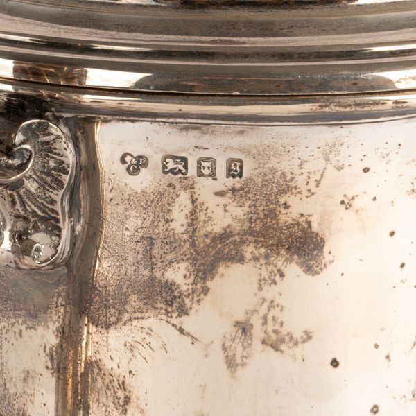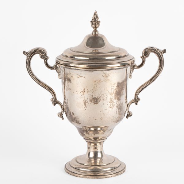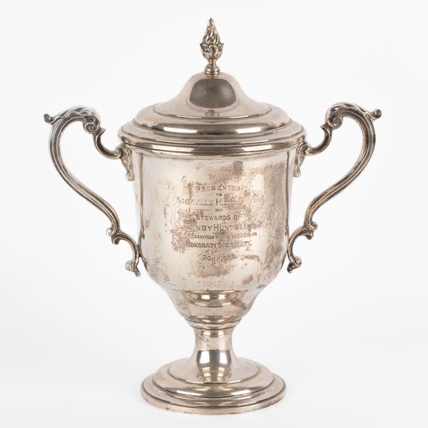 A silver two-handled trophy cup and cover, Charles & Richard Comyns, London 1922, the cover with bud finial, the cup with leaf-capped S-scroll handles, inscribed to Sackville H.E.C Owen by the Stewards of the Tenby Hunt Week, 33cm high, approximately 1269g