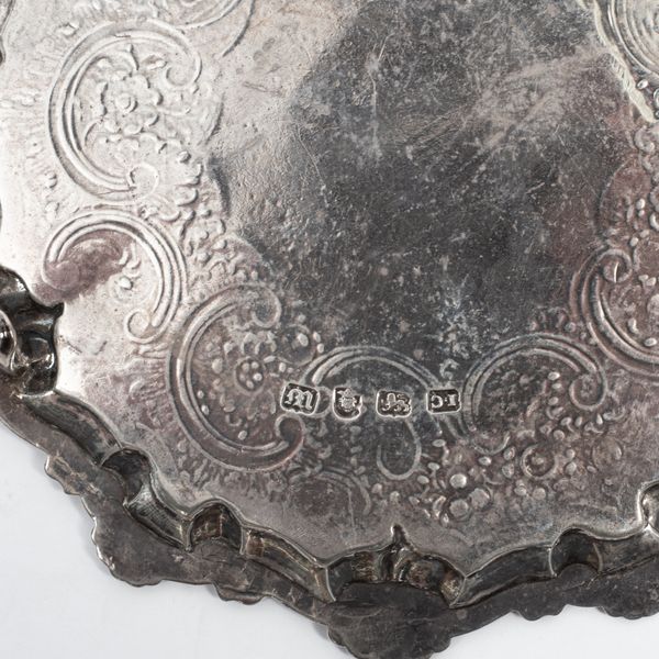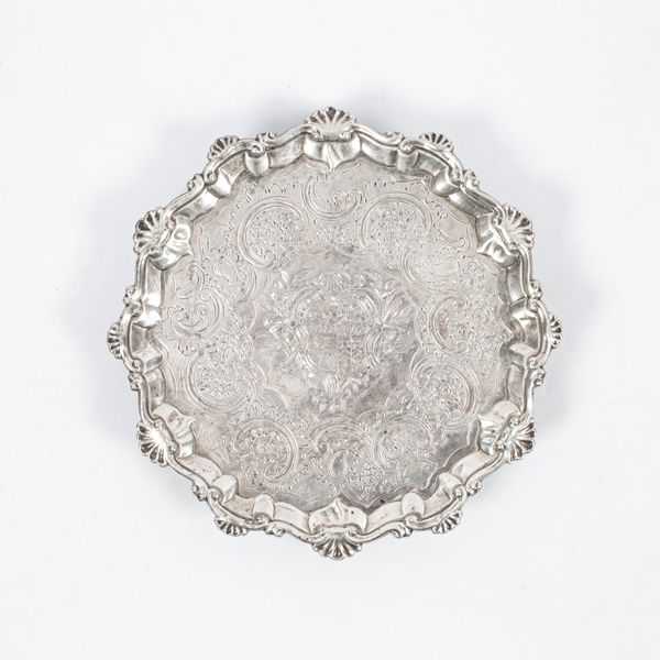 A George III silver card waiter, I.C, London 1767, with pie crust border and shell and scroll rim, central armorial of Green impaling Key and others, 18cm wide approximately 248g
