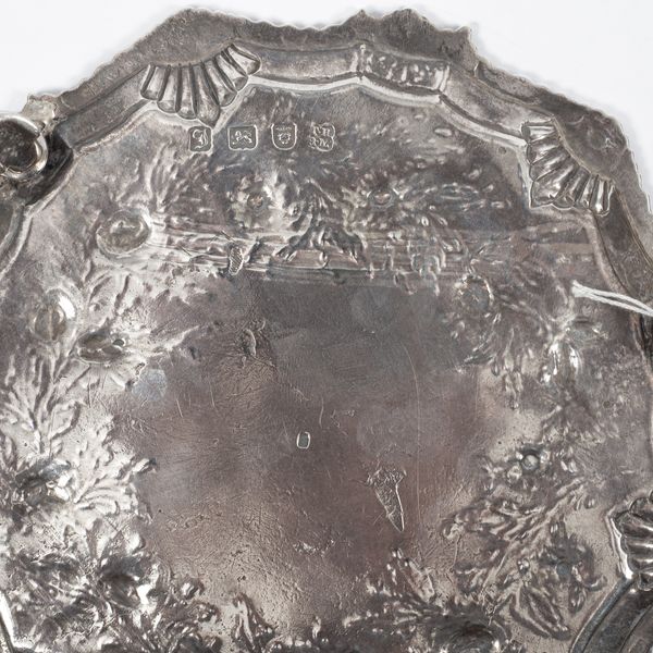 A George III silver waiter, Thomas Hannam & Richard Mills, London 1764, centred by the crest of Saunders, 19cm wide and a Victorian silver card case, Joseph Willmore, Birmingham 1843, with leaf scroll decoration to an engine turned ground, initialled and crested for Mrs Mary Anne Saunders, approximately 440g