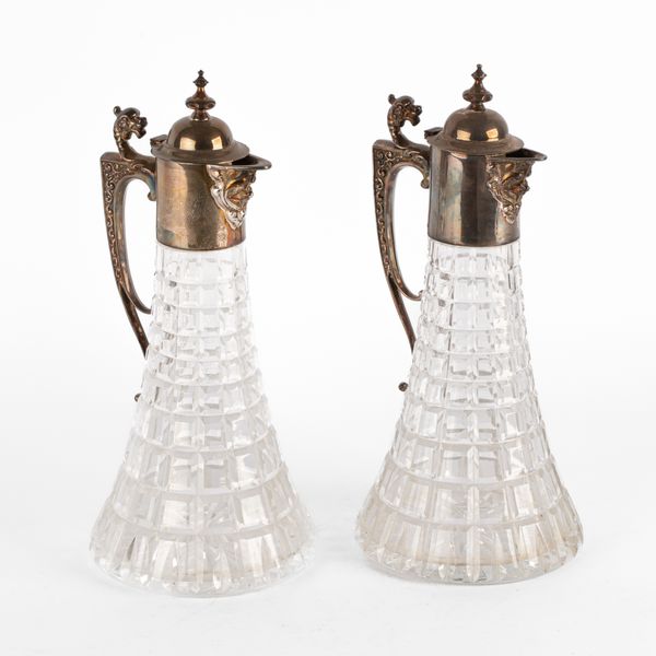 A pair of silver mounted claret jugs, Roberts & Belk, Sheffield 1969/1973, with hinged covers and mask heads to the handle, 31cm high