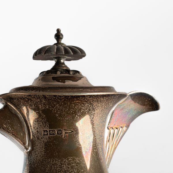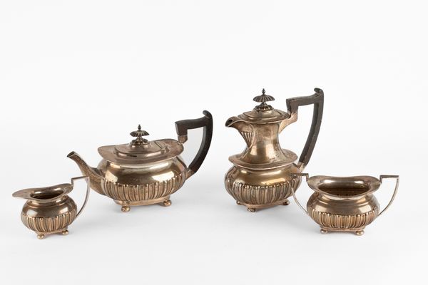 A silver tea set, Walker & Hall, Sheffield 1911-1913, of oval half-gadrooned form on bun feet, comprising teapot, hot water jug, cream jug and sugar basin, approximately 1475g