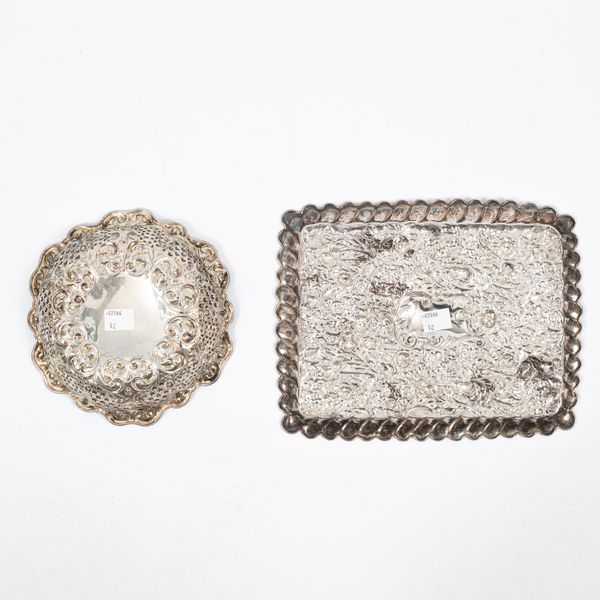 A late Victorian rectangular silver tray, Birmingham 1900, embossed with roses, thistles and shamrocks, 24.5cm x 19cm and a silver bonbon dish with pierced sides and wavy scrolling rim, London 1894, 17.5cm diameter, approximately 396g