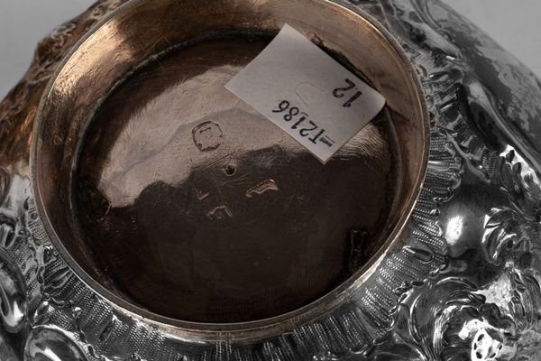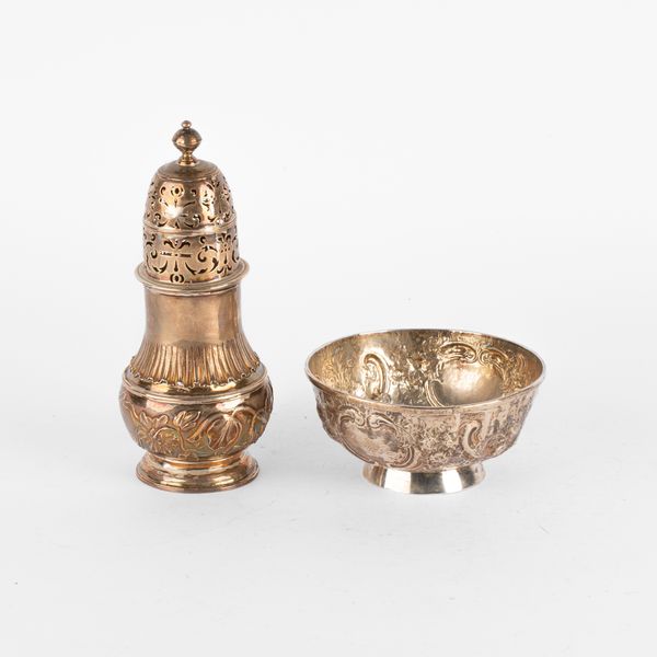 An early George I Britannia standard silver caster, Charles Adam, London 1714, with pierced domed cover and later floral decoration to the body, 19cm high and a silver bowl, marks rubbed, 13cm diameter, approximately 444g (2)