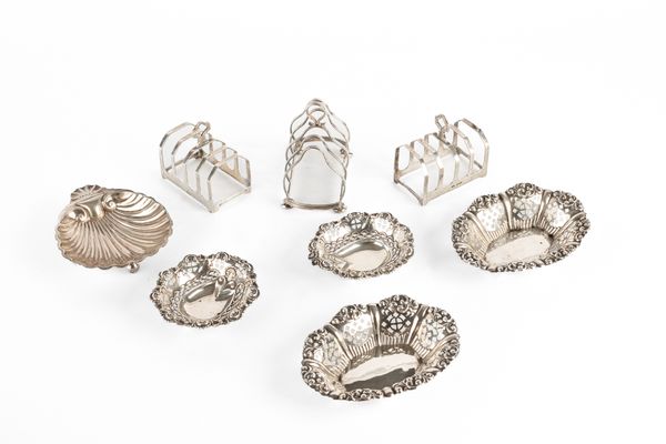 A quantity of silver to include a pair of Edwardian oval bonbon dishes, WD, Birmingham 1902, another pair of bonbon dishes marked Sterling, a butter shell, Sheffield 1888, a pair of toast racks and another toast rack, approximately 390g