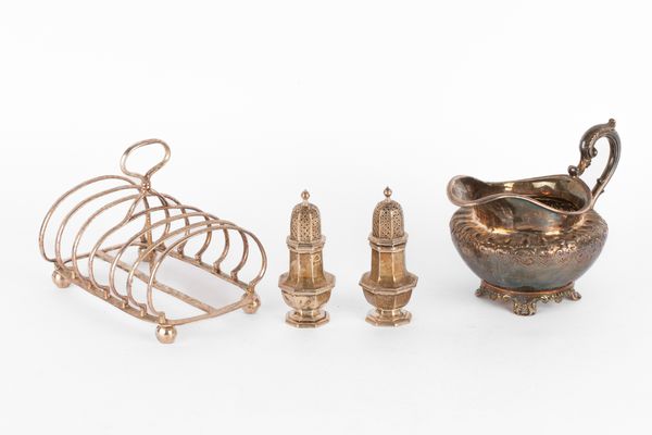 A William IV silver jug, J Wrangham & William Moulson, London 1835, with S-scroll handle, a Victorian toast rack, Charles Thomas Fox & George Fox, London 1852 and a pair of octagonal baluster pepper pots, London 1968, approximately 697g