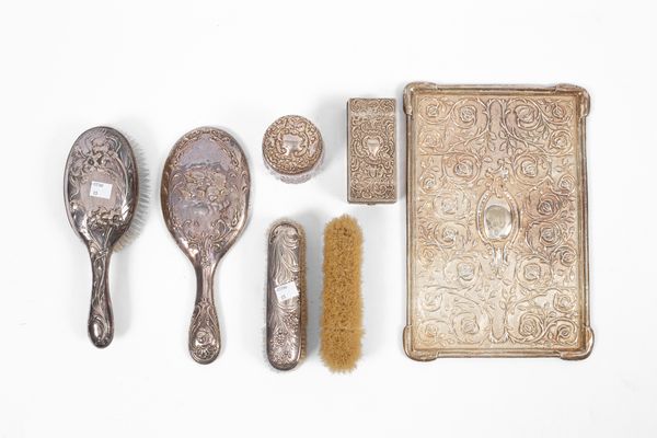 A quantity of silver dressing table items including a tray, Birmingham 1905, 32cm x 21.5cm, approximately 307g, a pair of silver backed clothes brushes and a hairbrush, William Comyns, London 1901, a hand mirror and a silver topped jar