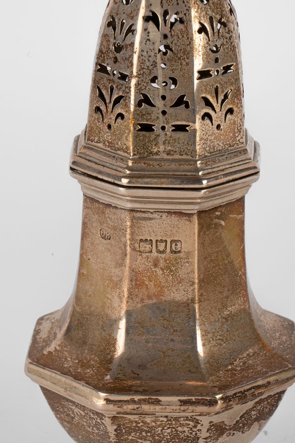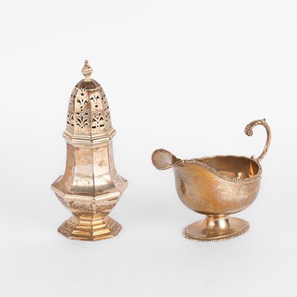 A late Victorian silver sugar caster CB, London 1900, of octagonal baluster form, 20cm high and a sauceboat, Chester 1906, approximately 495g