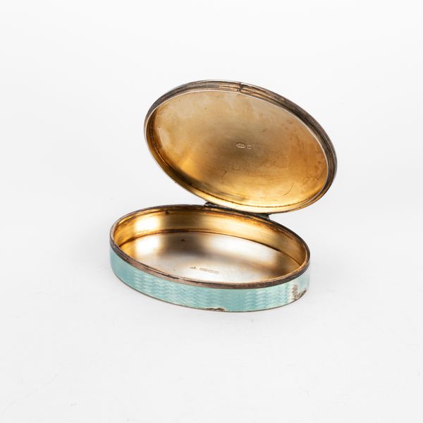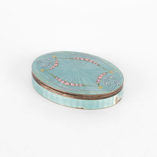 A silver and enamel oval trinket box import marks for Edith Jacob, Birmingham 1912, the cover in pale blue enamel with swags of roses, 11.5cm wide, approximately 242g