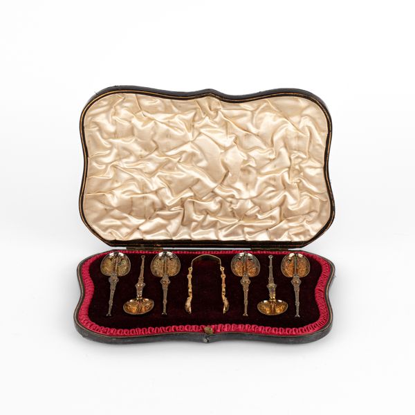 A set of six Edwardian silver-gilt teaspoons, Wakely & Wheeler, London 1901, with the matching sugar tongs, all of anointing spoon form, cased, approximately 129g