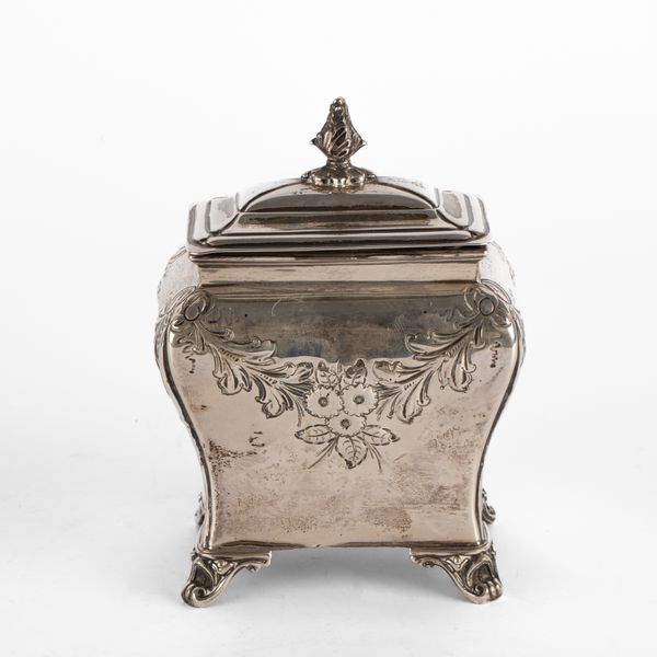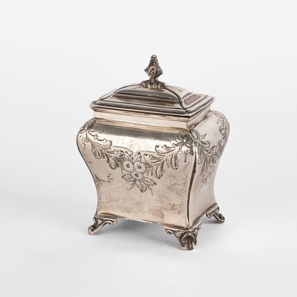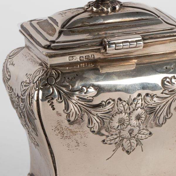 A late Victorian silver tea caddy, HS, Sheffield 1892, the hinged cover with bud finial and with floral swag decoration to the sides, 14cm high, approximately 276g