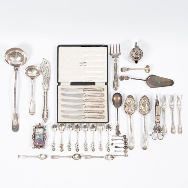 A pair of Victorian silver fish servers George Unite, Birmingham 1881, a set of six silver handled fruit knives and sundry white metal and silver plate (qty)